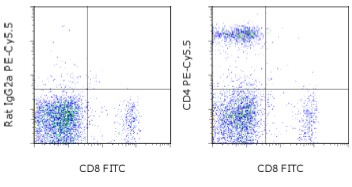Description: The RM4-5 monoclonal antibody reacts with the mouse CD4 molecule, a 55 kDa cell surface receptor expressed by a majority of thymocytes, subpopulation of mature T cells and dendritic cells. CD4 binds to MHC class II on the surface of antigen presenting cells and plays an important role both in T cell development and in optimal functioning of mature T cells. In T cells, CD4 associates with protein tyrosine kinase p56lck through its cytoplasmic tail. Binding of RM4-5 is blocked by GK1.5.
