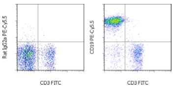 Description: The eBio1D3 monoclonal antibody reacts with mouse CD19, a 95 kDa transmembrane glycoprotein. CD19 is expressed by B cells during all stages of development excluding the terminally differentiated plasma cells. Follicular dendritic cells also express CD19. Together CD21, CD81, MHC class II, and CD19 form a multimolecular complex that associates with the BCR. Signaling through CD19 induces tyrosine phosphorylation, calcium flux and proliferation of B cells.