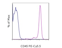 Description: The HI30 monoclonal antibody reacts with all isoforms of human CD45, also known as Leukocyte Common Antigen (LCA). CD45 is expressed by all hematopoietic cells excluding circulating erythrocytes and platelets. The cytoplasmic portion of CD45 has tyrosine phosphatase enzymatic activity and plays an important role in activation of lymphocytes.
