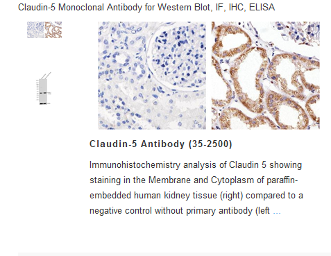 Mouse anti-Claudin-5; Unconjugated Monoclonal antibody specific to Human, Mouse, Rat Claudin-5 . This antibody is validated for use in Western Blot, Immunohistochemistry, Immunoassay (ELISA), Immunocytochemistry/ Immunofluorescence. Anti-Claudin-5 recognizes the expressed product of the CLDN5 gene, also known as Cldn5.
