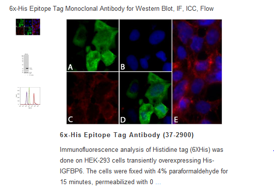 The His tag is a synthetic oligo peptide consisting of 6 consecutive histidine residues (HHHHHH). It is commonly expressed as a tag at either N-or C-terminal regions of recombinant proteins to allow isolation or purification by immobilized metal affinity chromatography. The His tag specific antibody is used to facilitate detection or coimmunopreciptation of tagged proteins.