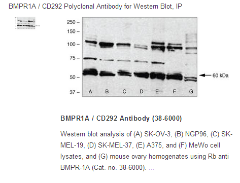 The bone morphogenetic protein (BMP) receptors are a family of transmembrane serine/threonine kinases that include the type I receptors BMPR1A and BMPR1B and the type II receptor BMPR2. These receptors are also closely related to the activin receptors, ACVR1 and ACVR2. The ligands of these receptors are members of the TGF-beta superfamily. TGF-betas and activins transduce their signals through the formation of heteromeric complexes with 2 different types of serine (threonine) kinase receptors: type I receptors of about 50-55 kD and type II receptors of about 70-80 kD. Type II receptors bind ligands in the absence of type I receptors, but they require their respective type I receptors for signaling, whereas type I receptors require their respective type II receptors for ligand binding. BMPRIA binds BMP4 with high-affinity in solution and is a potent BMP-4 antagonist in vitro. In adult tissues, BMPRIA is widely expressed, with the highest expression levels detected in skeletal muscle. BMPRIA is also widely expressed during embryogenesis.