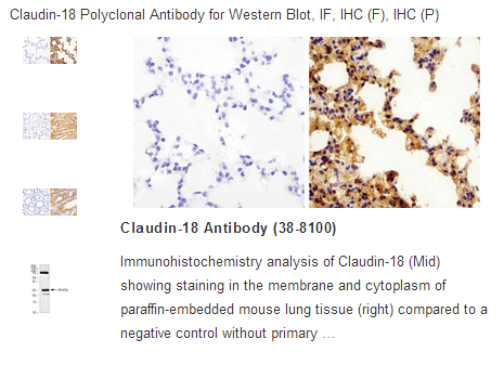 Claudin-18 is a tight junction protein expressed as lung-and stomach-specific isoforms which are generated by alternative splicing of the claudin-18 gene. The lung-specific form is a downstream target gene regulated by the T/EBP/NKX2.1 transcription factor. A splice variant lacking the C-terminal cytoplasmic domain also exists in mouse, but has not been confirmed in human. Human claudin-18 demonstrates 88% amino acid sequence identity to the mouse protein. Immunohistochemical studies have demonstrated complete membrane localization of claudin-18 in lung and stomach epithelial cells, while electron microscopy has shown that it is concentrated in the cell-cell borders of these cells. These features suggest a potentially important role for claudin-18 in the structure and function of tight junctions in the lung and stomach. Claudin-18 expression has also been reported in the inner ear. Because of its highly restricted expression pattern in normal tissues and frequent activation in numerous human cancers, claudin-18 may represent an important target for antibody therapy.
