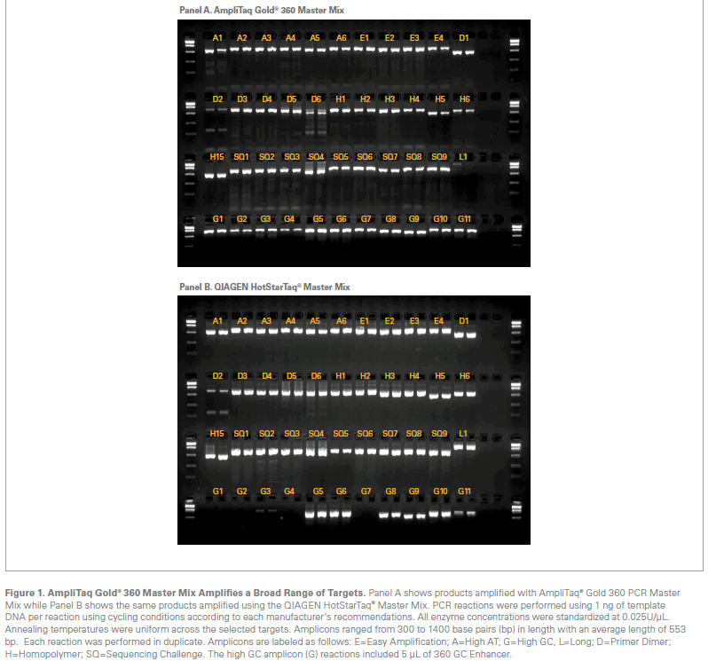 Extensively Tested AmpliTaq® 360 DNA Polymerase has been extensively tested and optimized across a broad panel of difficult targets for best-in-class performance. Challenging targets include AT-rich, GC-rich, primer-dimer forming amplicons, homopolymer repeats, and amplicons that pose sequencing challenges. Amplicons that previously required specialized enzymes and reaction conditions can now be amplified reproducibly with a single reagent under standardized conditions.
