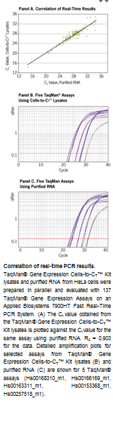The TaqMan® Gene Expression Cells-to-CT™ Kit workflow enables unsurpassed gene expression evaluation with any of the >700,000 TaqMan® Gene Expression Assays. This kit has been extensively tested for specificity with a broad selection of TaqMan® Gene Expression Assays and shows performance equivalent to that obtained with purified RNA (see figure).