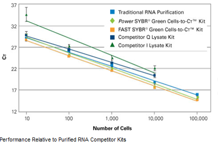 To demonstrate the performance of the kit, replicate experiments were run using either traditional RNA purification and real-time PCR analysis, or the FastSYBR® Green Cells-to-CT™ Kit. The kit shows equivalent performance to results obtained using purified RNA for analysis of 10 to 100,000 cells. In addition, the sensitivity, efficiency, and dynamic range were shown to be superior to competitor lysate kits. Samples prepared with the kit have been tested for compatibility on various real-time PCR platforms including those from Applied Biosystems®, Roche, and Bio-Rad.