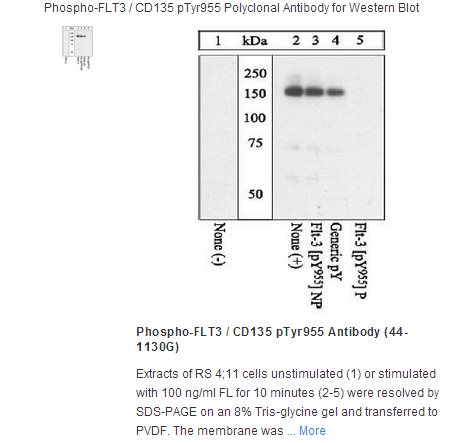The antiserum was produced against a chemically synthesized phosphopeptide derived from the region of human FLT3 that contains tyrosine 955. This sequence is conserved in chimpanzee (100% homologous), cow and canine (90% homologous), and mouse (80% homologous).