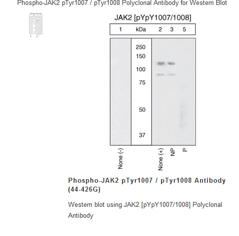The antiserum was produced against a chemically synthesized phosphopeptide derived from a region of mouse JAK2 that contains tyrosines 1007 and 1008.