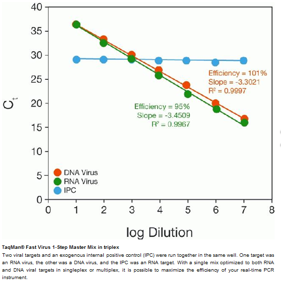 The TaqMan® Fast Virus 1-Step Master Mix speeds your time to results and maximizes the use of your real-time PCR instruments with a fast protocol. The high-concentration formulation allows for more target nucleic acid sample to be added in the smaller reaction volumes required to run fast protocols. This enables you to maintain sensitivity with low-titer research samples while improving speed and throughput (Figure 5).