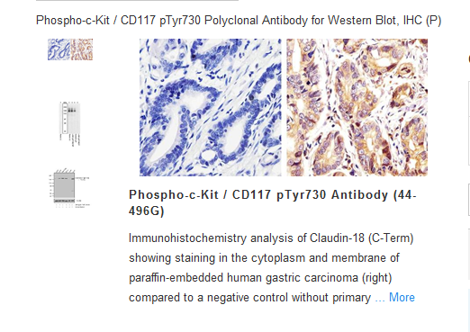 The antiserum was produced against a chemically synthesized phosphopeptide derived from a region of human c-Kit that contains tyrosine 730. The sequence is conserved in mouse, rat and cow.