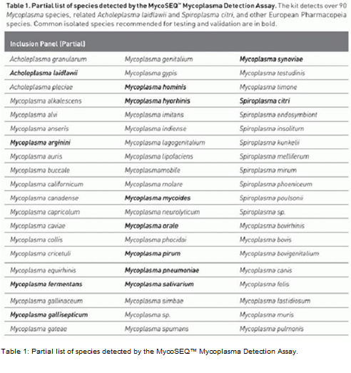 To help ensure the highest level of confidence in testing for the presence of Mycoplasma, an assay must have the ability to detect all known Mycoplasma species, not just the most common species. Intensive bioinformatics analysis was utilized to design amplification primers and reaction conditions to allow comprehensive detection of known Mycoplasma, Acholeplasma, and Spiroplasma species (Table 1), while avoiding detection of related bacterial species.