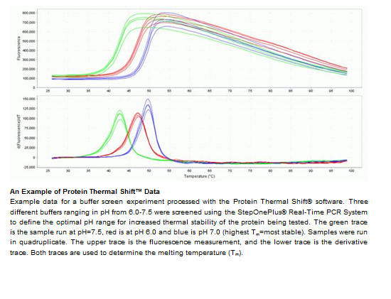Applied Biosystems® Protein Thermal Shift™ kits allow users to employ a dye that binds to exposed hydrophobic residues to monitor the thermal stability of proteins using a real-time PCR instrument in order to identify buffer conditions that stabilize the protein of interest or screen libraries of ligands for compounds that bind the protein of interest.