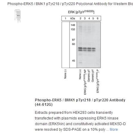The antiserum was produced against a chemically synthesized phosphopeptide derived from the region of human ERK5 that contains threonine 218 and tyrosine 220. The sequence is conserved in mouse.