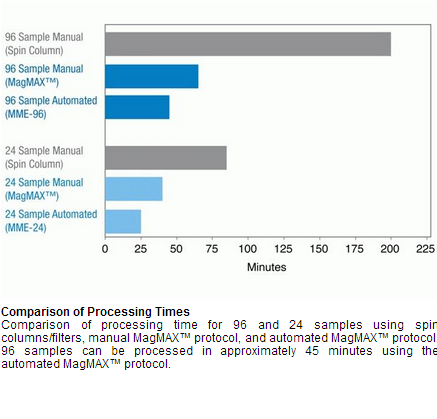 • Convenience and flexibility: one kit for RNA and DNA, suitable for a wide range of sample types sample input volumes • Increased confidence in your results: fewer false-negatives due to effective PCR inhibitor removal • Improved workflow efficiency: process 96 samples in approximately 45 minutes using the MagMAX™ Express-96 Deep Well Magnetic Particle Processor