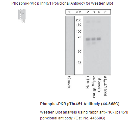 The antiserum was produced against a chemically synthesized phosphopeptide derived from the region of human PKR that contains threonine 451.