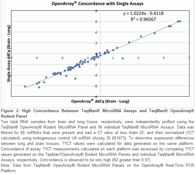 The TaqMan® OpenArray® Rodent MicroRNA Panel has demonstrated high concordance with an R2 value of 0.97 to the mostly commonly used tool for validation: individual TaqMan MicroRNA Assays (Fig 2). The same panel is used in the TaqMan® OpenArray® Rodent MicroRNA Panel, QuantStudio™ 12K Flex, enabling accurate answers to help minimize validation.
