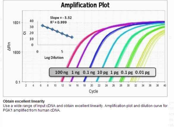 对于您的实时PCR应用,SYBR® Select预混液是一种优秀的高性价比解决方案。 SYBR® Select 预混液的特性包括: • 高特异性 — 可最大限度减少化引物二聚体及非特异性扩增的发生 • 高可重复性及灵敏性 — 可在广泛动态范围内保持一致的扩增 • 明亮 — 含有SYBR® GreenER™染料,可以最大限度提高染色亮度 • 残留污染对照 — 含热不稳定性UDG • 可用于标准循环模式或快速循环模式 针对最大限度提升特异性需要专门配制 SYBR® Select 预混液含有实时PCR反应所需的一切成分——模板与引物除外——并以方便使用的2X浓度预混液的形式提供。此预混液含有AmpliTaq® UP型DNA聚合酶,其经过高度纯化并运用了专利的热启动机制,具有异常出色的特异性。 可在广泛动态范围内获得可重复结果 SYBR® Select预混液的配方经过特别优化,在100 ng到0.1 pg cDNA作为起始的反应中均可获得出色的结果(图1),并可对单拷贝的基因组DNA进行可靠地检测(图2)。 含SYBR® GreenER™染料及热不稳定性UDG • 相比SYBR® Green I染料,SYBR® GreenER™染料对PCR反应的抑制作用更小,从而可以提供更明亮的信号。 • 产品中包含了热不稳定性的DNA尿嘧啶糖基化酶(UDG),从而提供了万无一失的残留污染对照。 仪器兼容性 SYBR® Select 预混液可用于标准循环模式或快速循环模式,除7900HT实时定量PCR系统以外的所有Applied Biosystems®实时定量PCR仪器均与之兼容。该试剂同时还兼容Bio-Rad IQ™5、Roche LightCycler® LC480及Stratagene® MX3005P®系统。