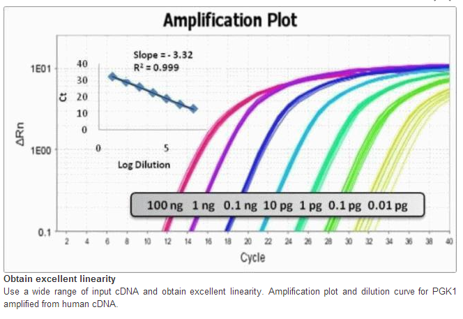对于您的实时PCR应用,SYBR® Select预混液是一种优秀的高性价比解决方案。 SYBR® Select 预混液的特性包括: • 高特异性 — 可最大限度减少化引物二聚体及非特异性扩增的发生 • 高可重复性及灵敏性 — 可在广泛动态范围内保持一致的扩增 • 明亮 — 含有SYBR® GreenER™染料,可以最大限度提高染色亮度 • 残留污染对照 — 含热不稳定性UDG • 可用于标准循环模式或快速循环模式 针对最大限度提升特异性需要专门配制 SYBR® Select 预混液含有实时PCR反应所需的一切成分——模板与引物除外——并以方便使用的2X浓度预混液的形式提供。此预混液含有AmpliTaq® UP型DNA聚合酶,其经过高度纯化并运用了专利的热启动机制,具有异常出色的特异性。 可在广泛动态范围内获得可重复结果 SYBR® Select预混液的配方经过特别优化,在100 ng到0.1 pg cDNA作为起始的反应中均可获得出色的结果(图1),并可对单拷贝的基因组DNA进行可靠地检测(图2)。 含SYBR® GreenER™染料及热不稳定性UDG • 相比SYBR® Green I染料,SYBR® GreenER™染料对PCR反应的抑制作用更小,从而可以提供更明亮的信号。 • 产品中包含了热不稳定性的DNA尿嘧啶糖基化酶(UDG),从而提供了万无一失的残留污染对照。 仪器兼容性 SYBR® Select 预混液可用于标准循环模式或快速循环模式,除7900HT实时定量PCR系统以外的所有Applied Biosystems®实时定量PCR仪器均与之兼容。该试剂同时还兼容Bio-Rad IQ™5、Roche LightCycler® LC480及Stratagene® MX3005P®系统。