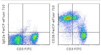 Description: The 90 monoclonal antibody reacts with the mouse CD38 molecule, an ~42 kDa type II transmembrane protein. CD38 is expressed at increasingly higher levels on B cells at each stage of B-cell differentiation, and is then down-regulated on germinal center B cells and mature plasma cells. Its expression is reported on a subpopulation of thymocytes, mature T cells, and NK cells. Crosslinking of CD38 on the surface of mature, resting B cells induces B-cell proliferation, which is enhanced by co-signals such as IL-4 and LPS. CD38, a counter-receptor for CD31, is an ectoenzyme with cyclase and hydrolase enzymatic activity and is speculated to play a role in lymphocyte activation and differentiation.