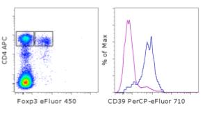 Description: The 24DMS1 monoclonal antibody reacts with mouse CD39, also known as NTPDaseI. E-NTPDases are enzymes that convert nucleoside tri- and diphosphates (NTDPs) into nucleoside monophosphate (NMP), thereby removing toxic extracellular ATP and ADP. CD39 is the dominant member of this family in the immune system and is involved in suppression of inflammation and control of platelet activation. CD39 can impact expression of CD73, another E-NTPase. Together, these molecules influence inflammation responses. CD39 is expressed on B cells, Langerhans cells and most monocytes. In addition, CD39 is found on a subset of CD4+ T cells that are mostly CD25+FoxP3+ T reg cells. T reg cells from CD39-null mice showed impaired suppressive properties in vitro and in vivo.