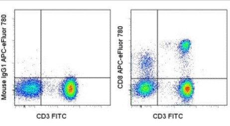 Description: The SK1 monoclonal antibody reacts with the human CD8a molecule, an approximately 32-34 kDa cell surface receptor expressed either as a heterodimer with the CD8 beta chain (CD8 alpha/beta) or as a homodimer (CD8 alpha/alpha). A majority of thymocytes and a subpopulation of mature T cells and NK cells express CD8a. CD8 binds to MHC class I and through its association with protein tyrosine kinase p56lck plays a role in T-cell development and activation of mature T cells.