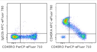 Description: The HI100 monoclonal antibody reacts with human CD45RA, a 220 kDa molecule expressed by subpopulations of CD4+ peripheral T lymphocytes, CD8+ peripheral T lymphocytes, and B cells. The CD45RA+ T cell populations are mainly naive/virgin allowing the use of HI100 mAb as a phenotypic marker to discriminate T cell subsets.