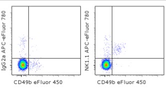 Description: The PK136 monoclonal antibody reacts with mouse NK1.1, an antigen expressed by natural killer cells and a subset of T cells in the NK1.1 mouse strains including C57BL and NZB. Several commonly used laboratory mouse strains such as BALB/c, SJL, AKR, CBA, C3H and A do not express the NK1.1 antigen. For detection of NK cells in these strains the monoclonal antibody DX5 (Cat. No. 14-5971) should be used. Simultaneous staining of C57BL/6 spleen cells with PK136 and DX5 reveals coexpression of both markers by a majority of cells as well as presence of small populations of DX5+PK136- and DX5-PK136+ cells.