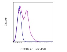 Description: The HB7 monoclonal antibody reacts with the human CD38 molecule, an approximately 45 kDa type II transmembrane protein. CD38 is an ectoenzyme which catalyses NAD into nicotinic acid adenine dinucleotide phosphate (NAADP) and cyclic ADP-ribose (cADPR), both of which are secondary messengers. Expression of CD38 is bimodal during B cell development, modulating from high in immature cells to low in intermediate ones and back to high on mature B cells. Additionally CD38 is found in a variety of tissues and other hematopoietic cells (e.g. T cells, NK cells and monocytes) and can be used to phenotype leukemias and monitor HIV-1 progression. The CD34+CD38- population of hematopoietic stems cells is thought to define the most pluripotent cells (e.g. blast colony forming cells). In addition to surface expression, CD38 has recently been found in the nucleus where it may play a role in monitoring calcium levels.