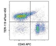 Description: The TER-119 monoclonal antibody reacts with mouse erythroid cells from early proerythroblast to mature erythrocyte stages. The TER-119 antigen is present in yolk sac, fetal and newborn liver, but is not expressed by cells carrying BFU-E and CFU-E activities. Several erythroleukemia cell lines tested so far are negative for expression of TER-119 antigen even after dimethylsulfoxide stimulation. Biochemical and molecular analysis of the TER-119 antigen indicate that this molecule is associated with the surface glycophorin A, but is not a typical glycophorin.