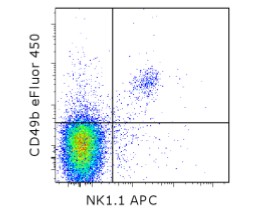 Description: The DX5 monoclonal antibody reacts with CD49b, an antigen expressed on a majority of mouse natural killer cells and a subset of T cells. DX5 reacts with all strains of mouse tested including the most commonly used strains, BALB/c, C57BL/6, C3H, CBA, DBA, AKR, SJL and 129. Simultaneous staining of C57BL/6 spleen cells with anti-NK1.1 mAb (PK136) and DX5 reveals coexpression of both markers by a majority of cells as well as presence of small populations of DX5+PK136- and DX5-PK136+ cells.