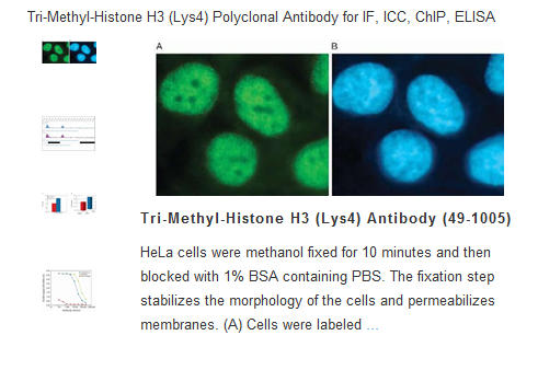 Raised against the region of the histone H3 containing the trimethylated lysine 4 (or [K4me3]), using a KLH-conjugated synthetic peptide.