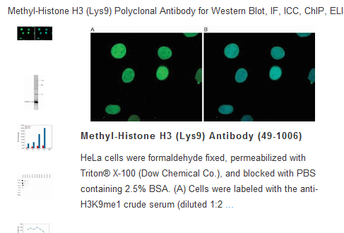 Raised against the region of the histone H3 containing the monomethylated lysine 9 (H3K9me1), using a KLH-conjugated synthetic peptide.