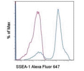 Description: The eBioMC-480 (MC-480) antibody reacts with the stage-specific embryonic antigen-1 (SSEA-1), a carbohydrate epitope expressed upon the surface of early mouse embryos, murine embryonal carcinoma cells (EC), murine embryonic stem cells (ES) and murine & human germ cells (EG). No immunoreactivity is evident with undifferentiated human EC and ES cells. Differentiation of human EC results in an increase in SSEA-1 expression, while in the mouse expression is diminished. SSEA-1 is associated with cell adhesion, migration and differentiation.