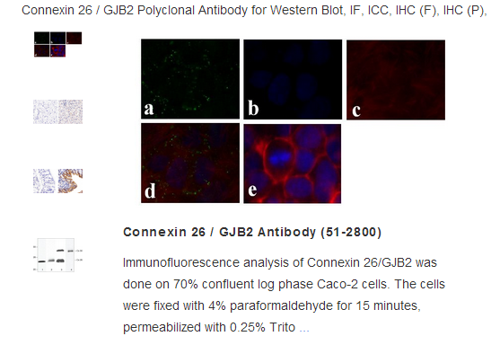 A 13 amino acid synthetic peptide derived from the C-terminus of the mouse Connexin 26 protein. This mouse sequence differs from the rat sequence by a single amino acid and from the human sequence by two (non-consecutive) amino acids.