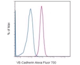 Description: The 16B1 antibody reacts with human CD144, also known as VE-cadherin and cadherin-5. The cadherin family of receptors, which are calcium-dependent adhesion molecules, is known to be involved in homophilic cell interactions. VE-cadherin, which is 140 kDa, is localized at the intercellular boundaries of endothelial cells in blood and lymphatic vessels in several tissues. It is thought to play a role in vascular permeability and remodeling.