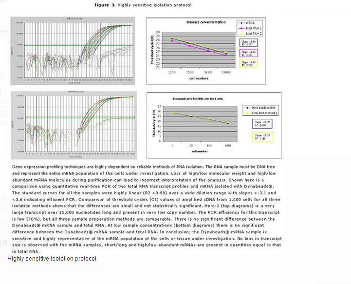 Dynabeads® Oligo(dT)25 mRNA isolation beads specifically target and capture mRNA molecules from virtually any crude sample and eliminate the need to purify total RNA when the desired information-bearing nucleic acid is mRNA. Since mRNA comprises only about 1–5% ot total cellular RNA, the isolation of total RNA is not the most efficient way to isolate mRNA. Other technologies designed to purify total RNA yield ~80% ribosomal RNA and force mRNA to compete with ribosomal RNA, transfer RNA, micro RNA, small nucleolar RNA, and small cytoplasmic RNA for membrane binding. Advantages of Dynabeads® Oligo(dT)25 beads: