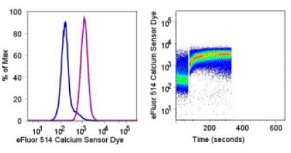 Description: eFluor™ 514 Calcium Sensor Dye is a membrane-permeable dye used for monitoring changes in intracellular free calcium concentrations in the cell using fluorescence microscopy, flow cytometry, fluorescence spectroscopy and fluorescence microplate readers. Once eFluor™ 514 Calcium Sensor Dye enters the cell, cellular esterases cleave the AM group yielding a membrane-impermeable dye fluorescing at ~520 nm . eFluor™ 514 Calcium Sensor Dye, like Fluo-3 and Fluo-4, is a commonly used dye among the visible light-excitable calcium indicators but with increased cellular uptake (even at room temperature) and brightness.