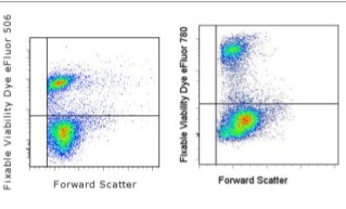 Description: Fixable Viability Dye eFluor® 506 and 780 are viability dyes that can be used to irreversibly label dead cells prior to cryopreservation, fixation and/or permeabilization procedures. Unlike 7-AAD and propidium iodide, cells labeled with Fixable Viability Dyes can be washed, fixed, permabilized, and stained for intracellular antigens without any loss of staining intensity of the dead cells. Thus, using Fixable Viability Dyes allows dead cells to be excluded from analysis when intracellular targets are being studied. Fixable Viability Dyes may be used to label cells from all species.