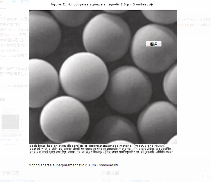 应用: 15 年来,链霉亲和素偶联的 Dynabeads® 已在许多应用中 得到使用和引用。 例如 核酸、 蛋白质/多肽以及其它靶分子的直接/间接分离和下游操作。 适用于基于核酸的诊断中的序列特异性 DNA/RNA 捕获,尤其是 离液盐浓度高的样品,涉及 生物素化小抗原的免疫分析以及与 BSA 不兼容的应用( 微珠不用 BSA 封闭)。 轻松适应自动化过程。 您 是否知道全世界有超过 25,000 台常规 IVD 仪器在使用 Dynabeads®? 结合容量: 分子的大小和生物素化步骤会 影响结合能力。 该能力还取决于空间可用度 以及珠和分子间及分子之间的电荷相互作用。 固定后,微珠表面的每个链霉亲和素分子对应 2 个或 3 个生物素结合位点。 1 mg Dynabeads® M-270 链霉亲和素通常能结合:
