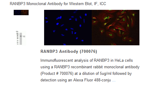 Ran binding protein 3 (RanBP3) is a member of Ran GTPase binding proteins that is located at the nuclear pore complex (NPC) and plays an essential role in the transport between cytoplasm and nucleus. RANPB3 is expessed as two spliced forms, RanBP3a and RanBP3b, both of which contains two FXFG motifs, characteristic of a subgroup of nucleoporins in addition to nuclear localization signal in the amino-terminal region (amino acid residues 40-57) and a unique acidic carboxyl terminus which is integral to its switch function.