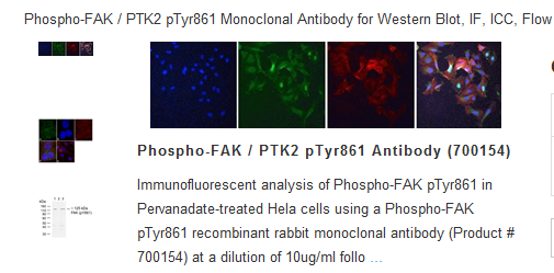 Focal Adhesion Kinase (FAK) is a 125 kDa non-receptor protein tyrosine kinase that acts as a substrate for Src and is a key element of integrin signaling. FAK plays a central role in cell spreading, differentiation, migration, cell death and acceleration of the G1 to S phase transition of the cell cycle. Regulation of FAK includes phosphorylation at multiple tyrosine and serine residues. Increased FAK tyrosine phosphorylation occurs upon integrin engagement with fibronectin.