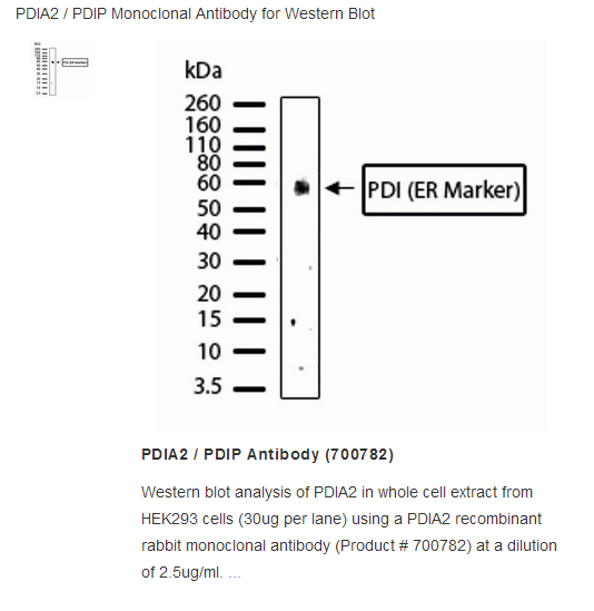 PDI (ER marker) also known as protein disulfide isomerase is an enzyme present in the ER which plays a very important role in protein folding, by facilitating formation of correct disulphide bonds. Processing and maturation of the secretory proteins in the endoplasmic reticulum are actively done by the family of PDI proteins. This class of proteins show similar homology to the cytoplasmic protein thioredoxin. The protein catalyses the thiol/disulphide interchange interactions. Also depending upon the type of polypeptide substrate and redox potential, the protein brings about protein disulfide formation, isomerization or reduction.