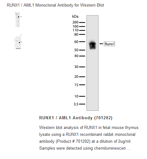 Runx1 belongs to the mammalian RUNX family of DNA binding proteins that regulate the expression of genes involved in cellular differentiation and cell cycle progression. Runx1 is essential for hematopoietic stem cell generation in the vascular regions of the aorta, vitelline and umbilical arteries, yolk sac and placenta. Runx1 is expressed in all tissues except brain and heart, with highest levels in thymus, bone marrow and peripheral blood.