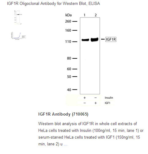 Insulin growth factor 1 receptor belongs to the family of tyrosine receptor kinases. It is involved in activation of various substrates including IGF and neurotensin, regulation of metabolism, cell division, maintenance, and inflammation response. The protein is a tetramer consisting of two alpha, and two beta subunits. The alpha-subunits binds to insulin growth factor 1 with higher affinity than to insulin growth factor 2. Binding results in a conformational change, followed by autophosphorylation of IGF-1R at positions 1134, 1135, 1136. The activated IGF-1R in turn, causes phosphorylation of substrate proteins, followed by sequential activation of RAS, RAF, and mitogen-activated protein kinase isoforms ERK, p38, and JNK, leading to the transcription of genes that drive proliferation. This antibody recognizes the beta-subunit of IGF-1R.
