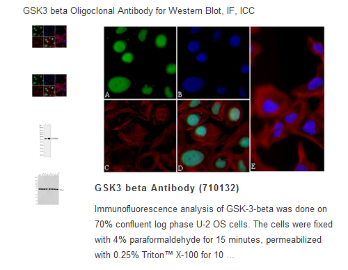 Glycogen synthase kinase-3 beta (GSK3 beta) belongs to the subfamily of glycogen synthase kinases, that play a central role in energy metabolism, neuronal cell development, and body pattern formation. GSK3 has alpha and beta isoforms (51 kDa and 47 kDa respectively), that are functionally dissimilar. GSK3 beta plays a role in insulin and Wnt signaling, and is inhibited following the extracellular signaling events.