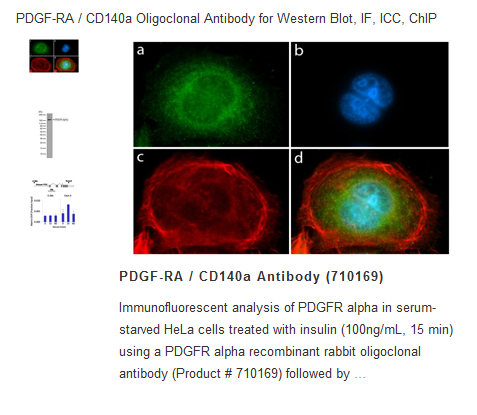 PDGFR-alpha belongs to the protein tyrosine kinase family, and binds to the alpha chain of PDGF. Members of the PDGF receptor subfamily are cell surface receptors that act as mitogens for cells of mesenchymal origin, and consist of alpha and beta isoforms of ~190, and 125 kDa, respectively. Activated PDGF receptors act on signaling pathways that control cell growth, actin reorganization, migration, and differentiation. In humans, the gene is located on the q arm of chromosome 4.