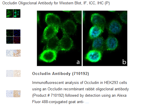 Tight junction group of proteins are a cell-to-cell adhesion structure in epithelial cells that constitute the epithelial junctional complex with adherens junctions and desmosomes. Tight junction strands are mainly composed of claudins, occludin, and JAM. Occludin is a 65 kDa protein and is considered to be vital in the assembly and maintenance of tight junctions. At the tight junction, occludin associates with membrane peripheral protein ZO-1. The expression of occludin varies greatly on the type of tissue. It is continuously and highly expressed in brain whereas non-neural tissues show lower expression and discontinuous distribution. Overall structural features of the occludin protein are highly conserved in all the species examined. Under-expression of tight junction proteins, including occludin, is a key molecular abnormality responsible for the increased permeability of tumor endothelial tight junctions, which contributes to brain tumor edemas