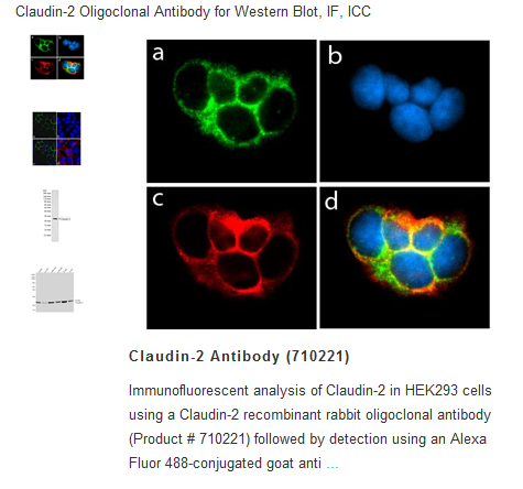 Claudin-2 belongs to the claudin family of integral membrane proteins. claudins are responsible for the formation of tight junction strands, and are connected to the actin cytoskeleton through ZO-1. Claudin-2 functions as a paracellular channel with cation (Na+) selectivity at tight junctions. The expression of claudin-2 is restricted to the liver and kidney, with small amounts also found in the brain.