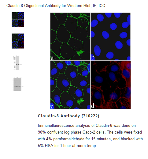 Claudin-8 belongs to the claudin family of integral membrane proteins. Claudins are responsible for the formation of tight junction strands, and are connected with the actin cytoskeleton mediated by ZO-1. Claudin-8 is a tight junction protein expressed in several distal nephron segments, suggesting that it may have a role as a paracellular cation barrier protein. Claudin-8 is expressed in the inner ear, and the umbrella cell tight junctions in the bladder epithelium.