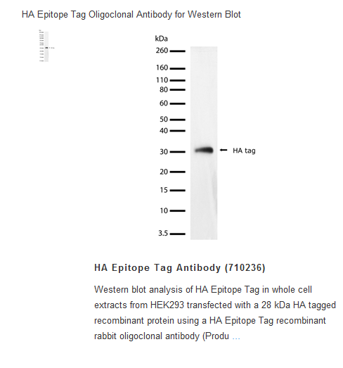 HA (hemagglutinin) is a surface glycoprotein derived from influenza hemagglutinin, and is commonly expressed as a tag in conjunction with proteins to aid in identification and purification of the tagged protein for functional analysis. The tag specific antibody is used to facilitate detection or coimmunopreciptation of tagged proteins.